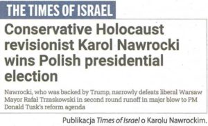 Po zwycięstwie Karola Nawrockiego w wyborach prezydenckich portal Times of Israel opublikował artykuł pt. „Conservative Holocaust revisionist Karol Nawrocki wins Polish presidential election” (Konserwatywny rewizjonista Holocaustu wygrał wybory prezydenckie w Polsce). W artykule napisano, że uczynił re-wizjonizm Holokaustu częścią swojej kampanii. Zacytujmy najciekawsze fragmenty: „Nawrocki, którego wspie-rałTrump, nieznacznie pokonał liberalnego prezydenta Warszawy Rafała Trzaskowskiego w drugiej turze wyborów, co jest poważnym ciosem dla programu reform premiera Donalda Tuska. (…) Konserwatysta Karol Nawrocki, który uczynił rewizjonizm Holokaustu częścią swojej kampanii, wygrał weekendowe wybory prezydenckie w Polsce, zgodnie z ostatecznym wynikiem głosowania w poniedziałek. (…) Wynik sugeruje, że można się spodziewać, że Polska pod rządami nowego lidera, którego poparł prezydent USA Donald Trump, podąży bardziej populistyczną i nacjonalistyczną ścieżką. (…) Nawrocki,42-letni bokser amator i historyk, został wybrany przez partię Prawo i Sprawiedliwość jako jeden z elementów jej działań na rzecz nowego początku. (…) Ostatnio Nawrocki był szefem Instytutu Pamięci Narodowej, który promuje nacjonalistyczne narracje historyczne, gloryfikujące polską ofiarę i opór wobec nazistów podczas II wojny światowej, jednocześnie delegitymizując badania nad polskim antysemityzmem lub Polakami, którzy zabijali Żydów.